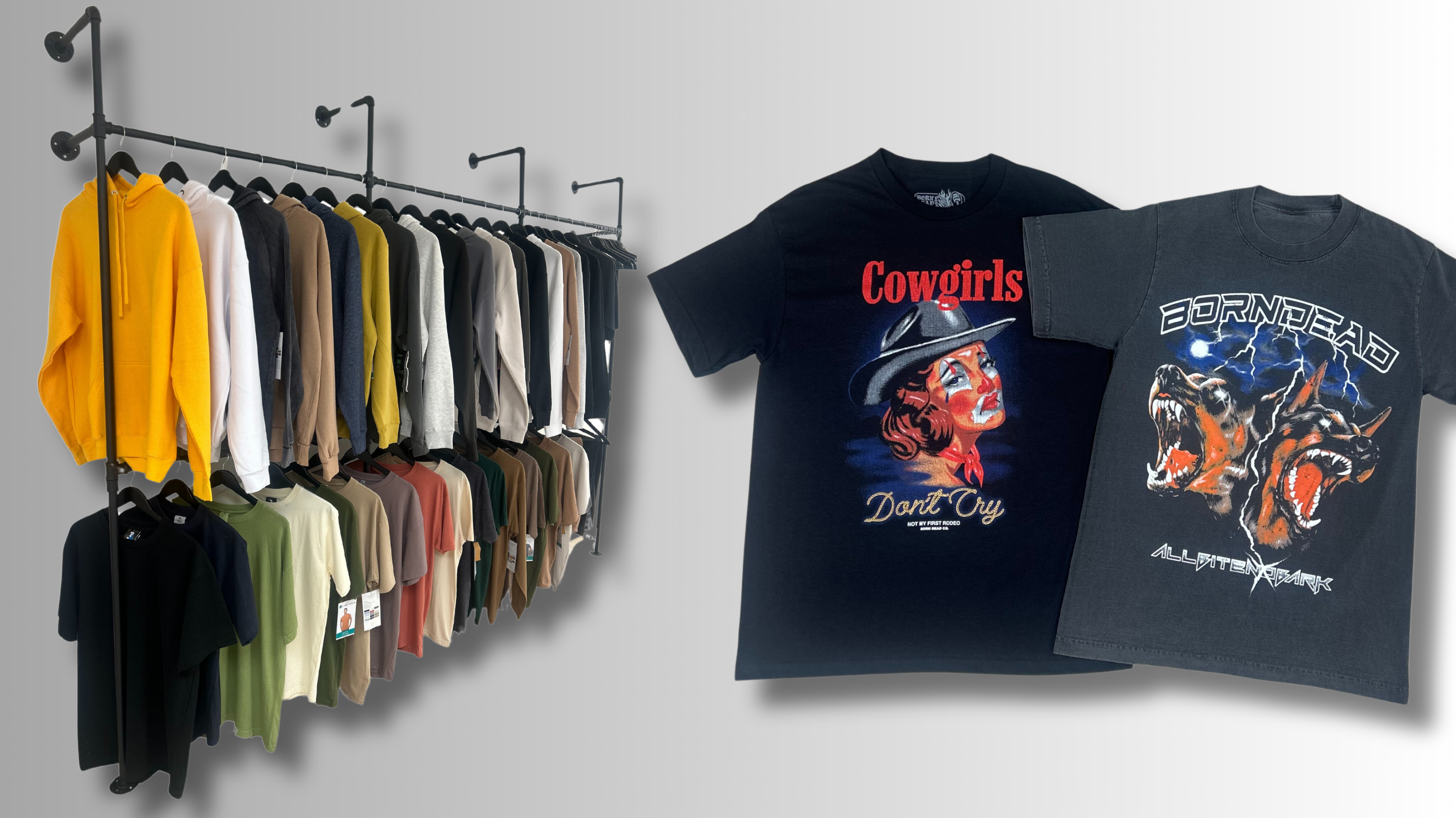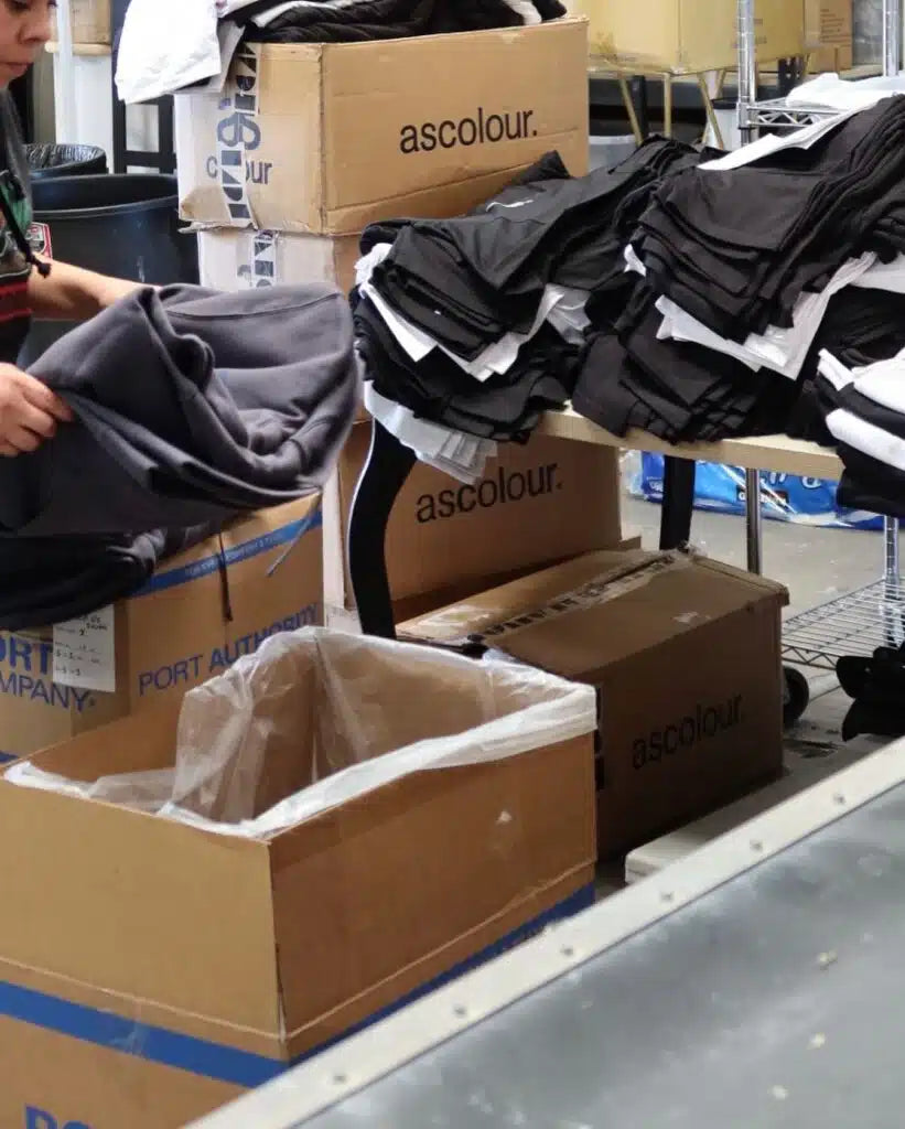 We specialize in screen printing, embroidery, DTF printing, finishing services (tagging, fold & bag, labeling), and merch fulfillment. Every order is produced in-house at our Orange County facility for speed, quality, and reliability.